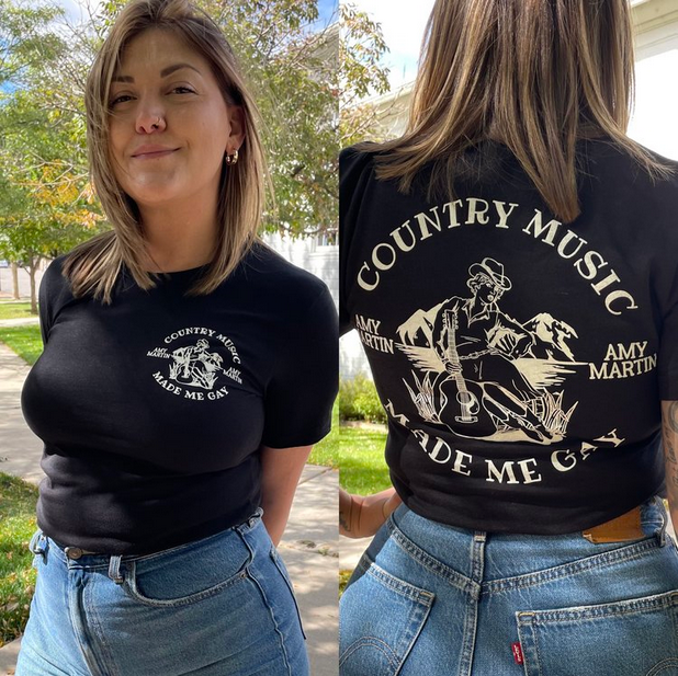 Amy Martin just might win this t-shirt contest with her “Country music made me gay” t-shirt.